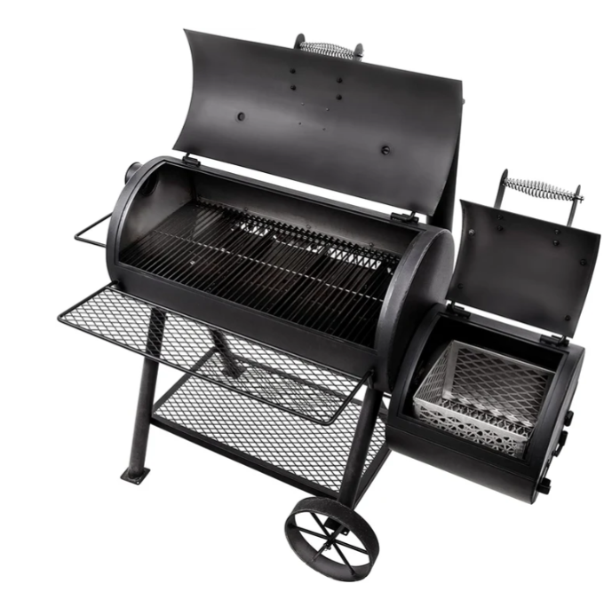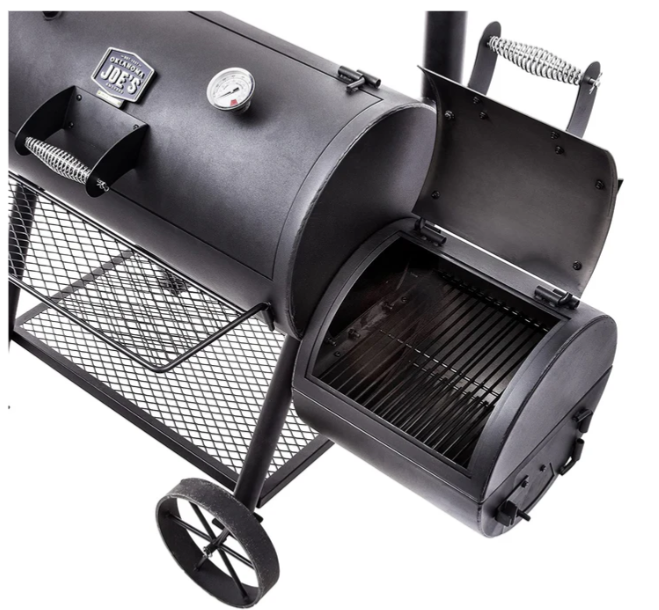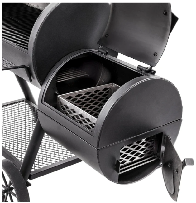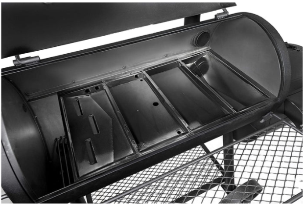 Incluye cuatro deflectores de acero extraíbles que guían el humo, así como una chimenea montada al frente para garantizar la circulación correcta. Además, su caja lateral de fuego facilita mantener el calor indirecto y el sabor auténtico de la leña o el carbón.
