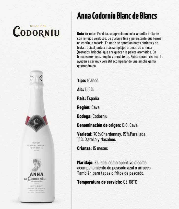El Anna Codorníu Blanc de Blancs 750ml es un cava elegante y moderno, elaborado principalmente con Chardonnay y complementado con Macabeo y Parellada. Presenta un color amarillo brillante con reflejos verdes y una burbuja fina y persistente que forma cintas continuas. En nariz destaca por sus notas frescas cítricas, frutas tropicales y aromas de crianza que aportan complejidad.