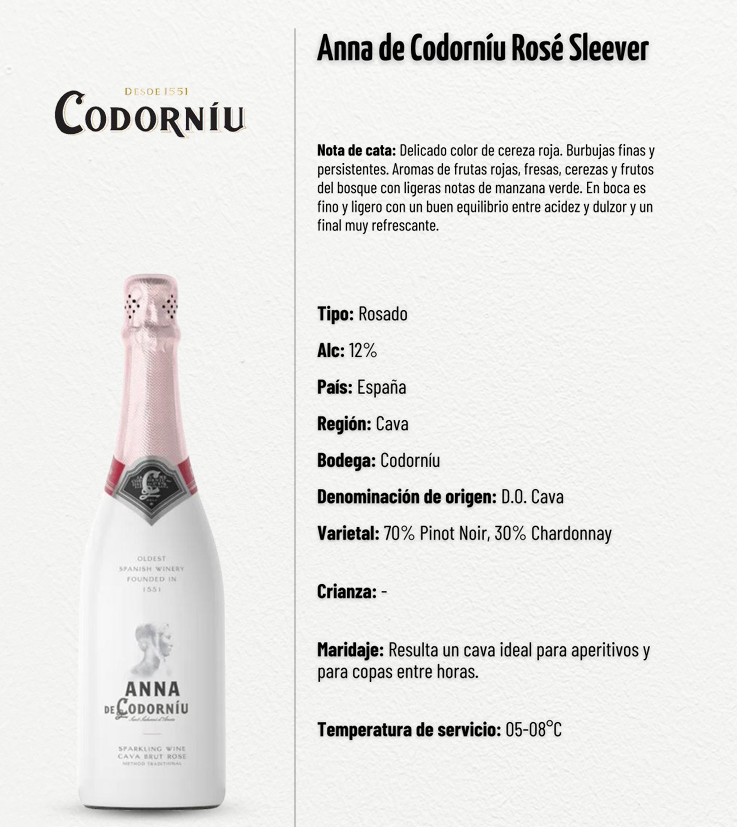 Anna de Codorníu Rosé Sleever es un cava rosado elegante y fresco, elaborado principalmente con Pinot Noir y un toque de Chardonnay que aporta equilibrio y suavidad. Presenta un delicado color cereza roja, acompañado de burbujas finas y persistentes. En nariz destacan aromas de fresas, frambuesas, cerezas y sutiles notas de frutos del bosque, complementados con matices de manzana verde.