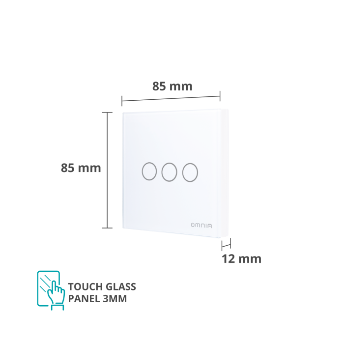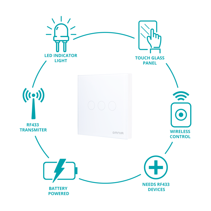 Gracias a su diseño limpio y minimalista, se integra perfectamente en cualquier ambiente, desde residencias hasta oficinas. Opera mediante radiofrecuencia (433 MHz) y es completamente compatible con los receptores OMNIA RF.