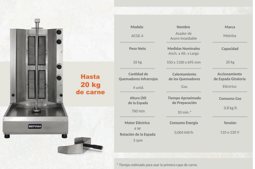 El Asador Shawarma a Gas APV modelo ACGE.4 está diseñado para uso comercial intensivo. Su estructura vertical, quemadores de alta potencia y diseño robusto lo hacen ideal para preparar shawarma, giros, tacos al pastor y carnes al estilo rotisserie, con cocción uniforme y gran capacidad.