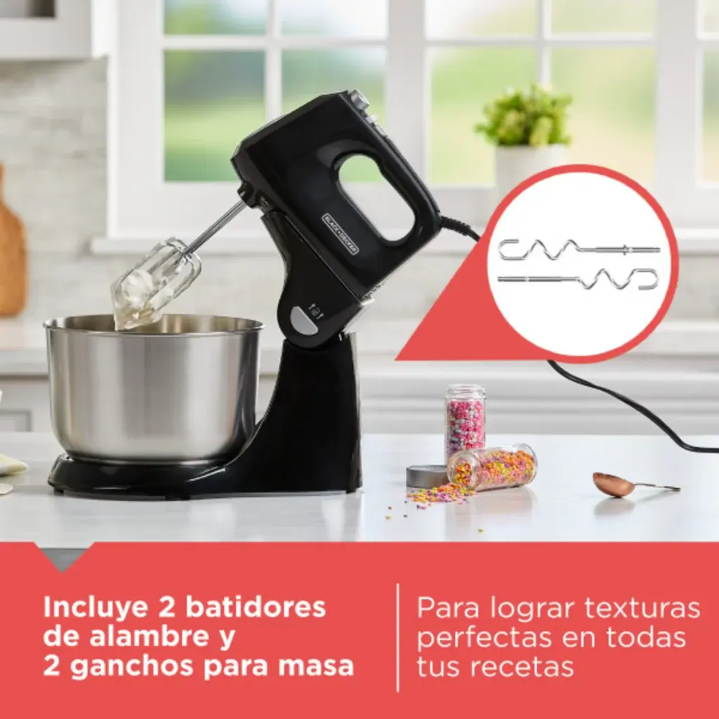 Accesorios para diferentes preparaciones. Incluye batidores de alambre para mezclas ligeras y ganchos para masa, ideales para repostería y preparación de masas.