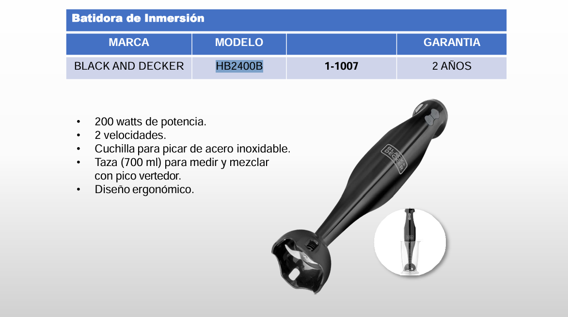 La Batidora de Inmersión Black&Decker HB2400B es una herramienta compacta y versátil para tu cocina. Con 200 W de potencia y 2 velocidades, podés preparar sopas, purés, batidos, salsas y más directamente en la olla o recipiente sin ensuciar.