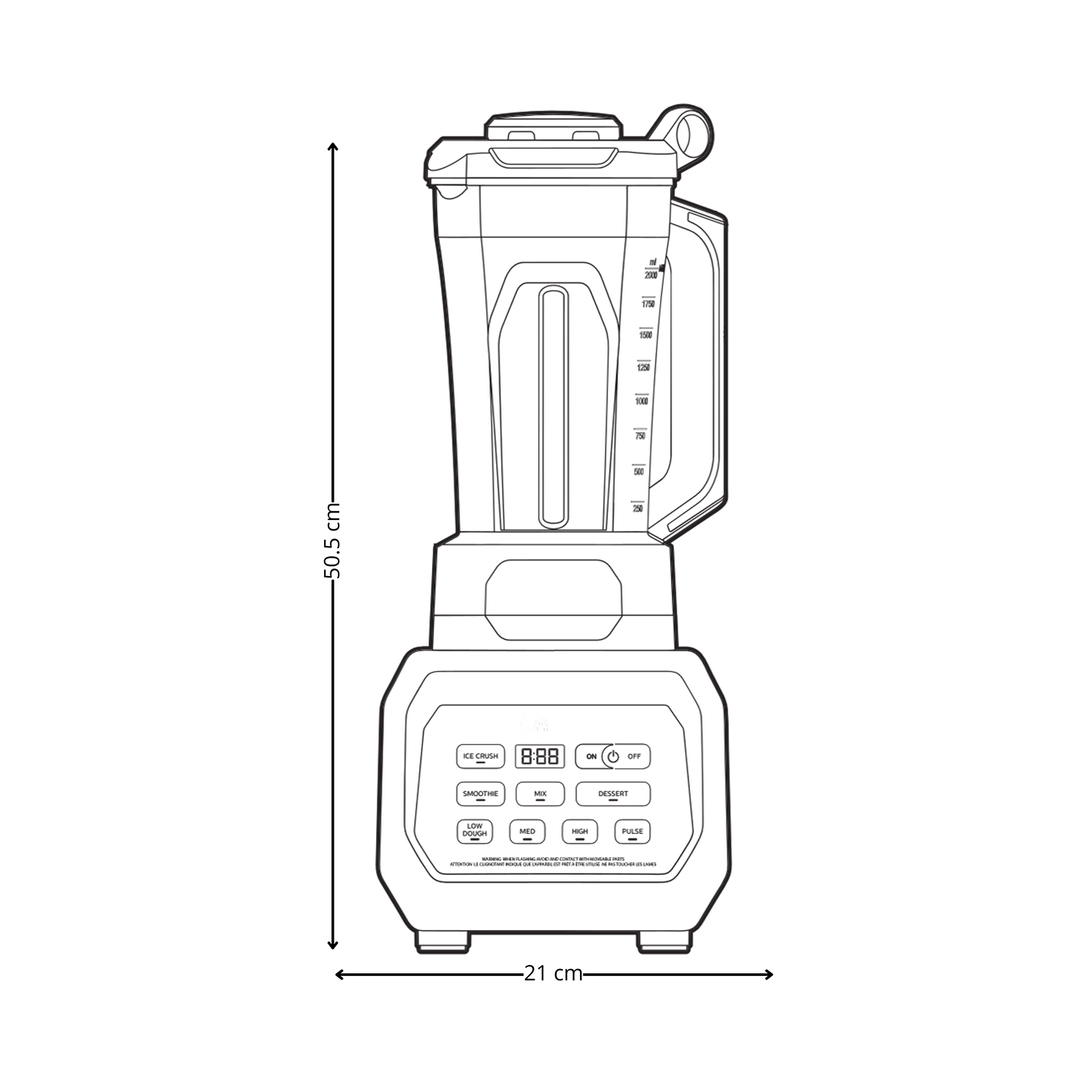 El panel digital facilita un manejo preciso con tres velocidades y función pulso, mientras que la tecnología de cuchillas multicapa mejora la eficiencia de corte y la textura final. Incluye jarras personales con tapas y cuchillas dedicadas, pensadas para llevar bebidas listas sin necesidad de trasvasar. Su capacidad principal de 2.0 litros la hace perfecta tanto para uso familiar como individual, combinando potencia, practicidad y seguridad con certificación UL.
