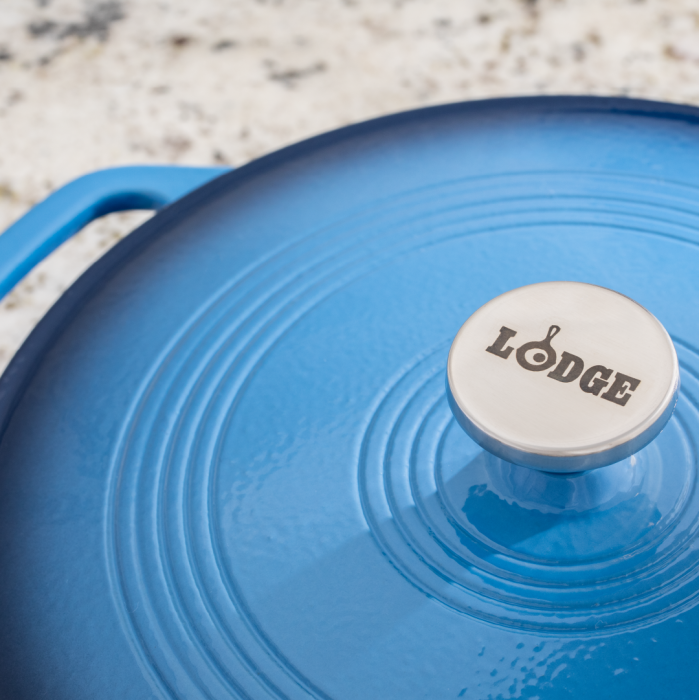 La cacerola Lodge de 3.6 litros en color azul (Caribbean Blue) es perfecta para cocinar, hornear, asar o servir directamente en la mesa. Su diseño bajo y ancho la hace ideal para recetas donde importa la superficie de cocción.