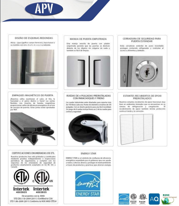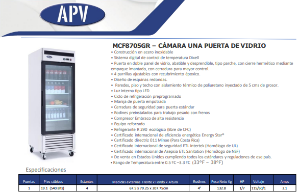 La Cámara Vertical APV de 19 pies cúbicos con 1 puerta de vidrio es la solución ideal para negocios que requieren exhibir y conservar productos a la temperatura adecuada. Su diseño vertical optimiza el espacio, mientras que la puerta de vidrio templado permite una visibilidad total del interior sin necesidad de abrirla, reduciendo la pérdida de frío y mejorando la eficiencia energética.
