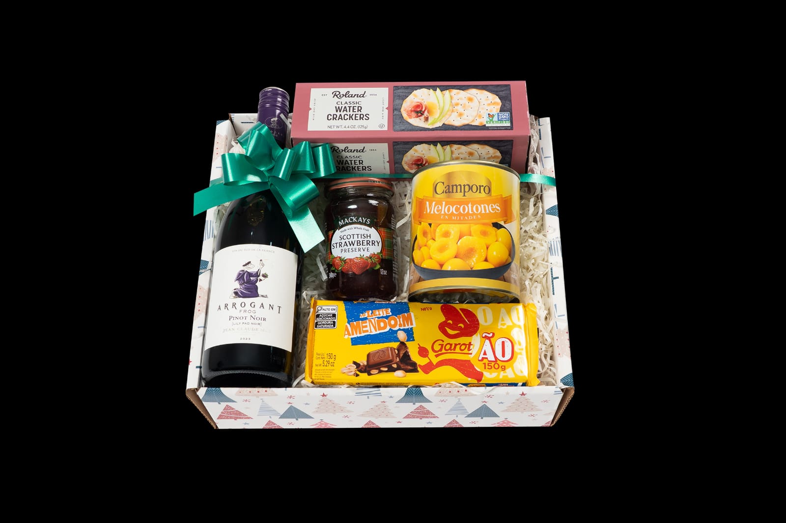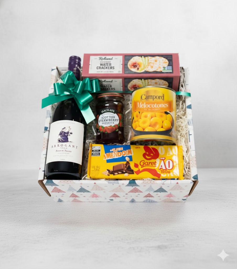 La Canasta Vino Arrogant Pinot Noir combina elegancia y sabor en una presentación premium ideal para regalos u ocasiones especiales. Incluye un vino francés Arrogant Frog Pinot Noir, reconocido por su aroma y suavidad; acompañado de mermelada de fresa Mackays, melocotones en mitades Camporo, galletas tipo cracker Roland y una tableta de chocolate Garoto.