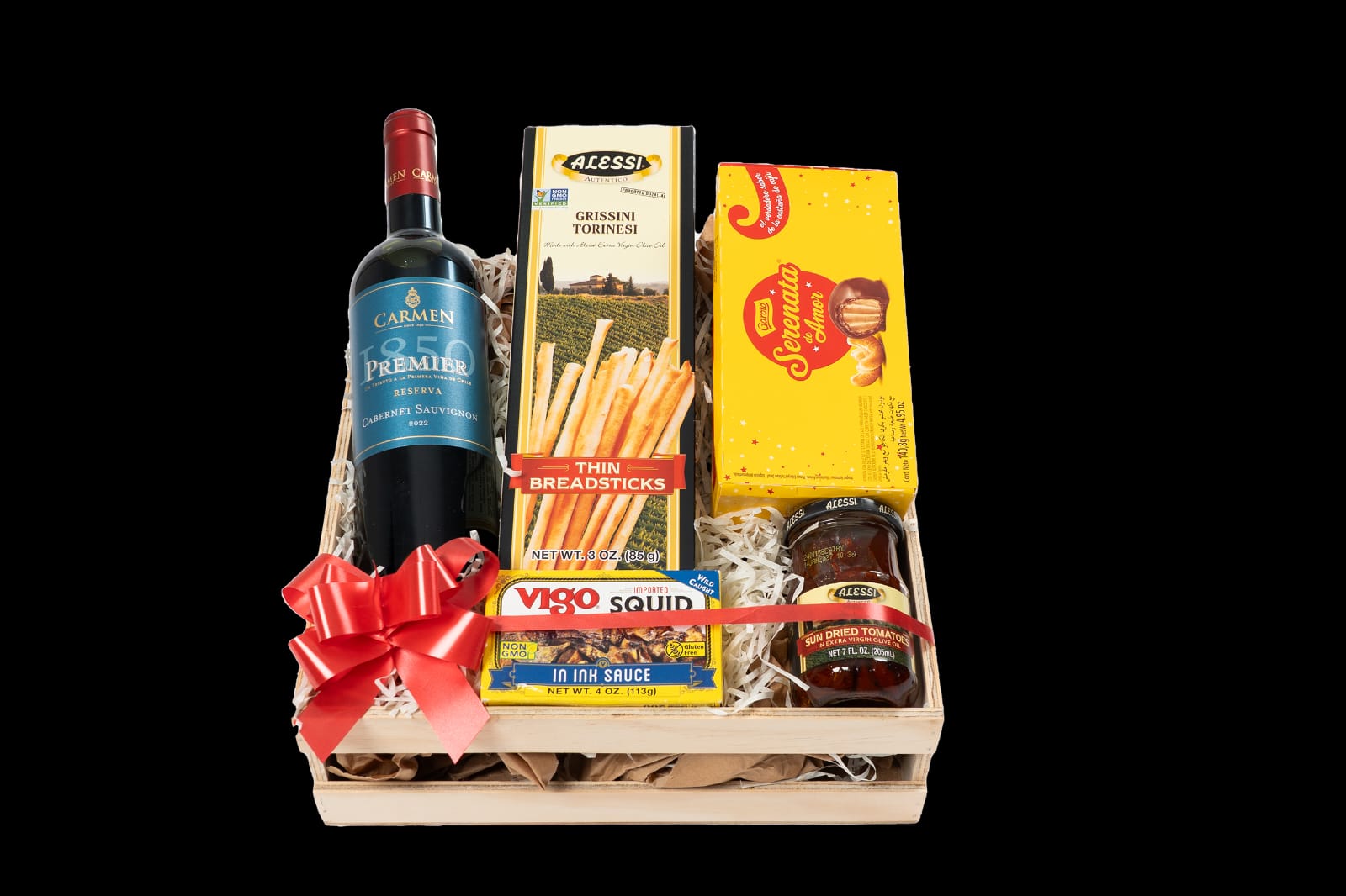 La Canasta Vino Carmen Premier ofrece una selección equilibrada y elegante de productos gourmet importados. Incluye un vino chileno Cabernet Sauvignon de carácter intenso, acompañado de grissini italianos, wafers Serenata de Amor, calamares en su tinta Vigo, tomates secos Alessi y una caja de madera de presentación.
