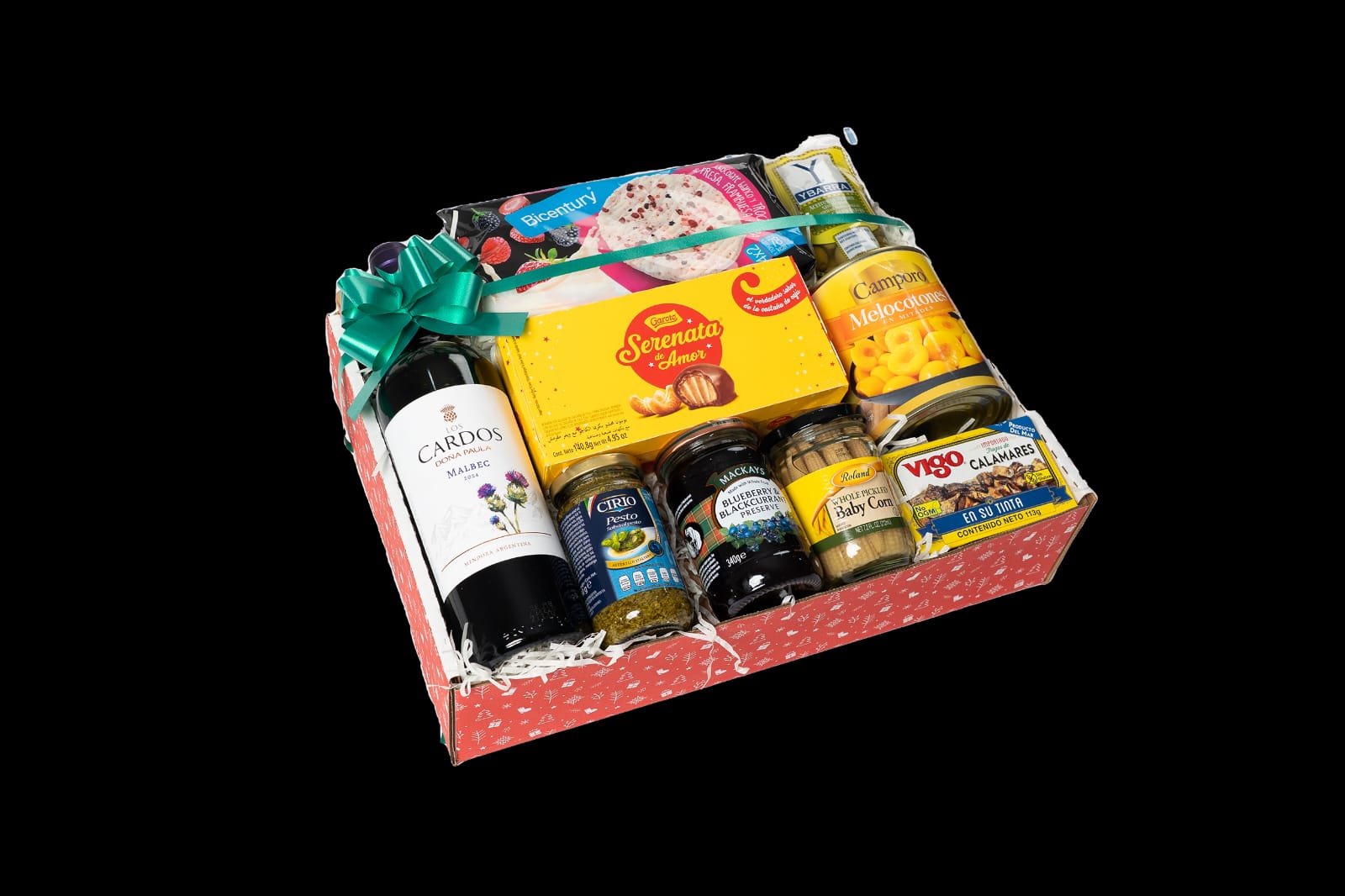 Esta canasta gourmet reúne una selección equilibrada de productos premium para regalar o compartir. Incluye el vino argentino Doña Paula Cardos Malbec 750 ml, acompañado de tortitas de arroz cubiertas, pesto italiano, mermelada gourmet, elotitos en vinagre, calamares en su tinta, melocotones en almíbar, aceitunas manzanilla y una caja de chocolates Serenata de Amor. Todo viene presentado en una bandeja decorada de gran tamaño.
