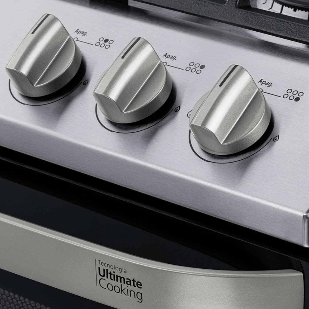 Las parrillas robustas brindan estabilidad para mover ollas y sartenes; el encendido eléctrico facilita el arranque en tope y horno*. El acabado Silver luce moderno y se limpia con facilidad.