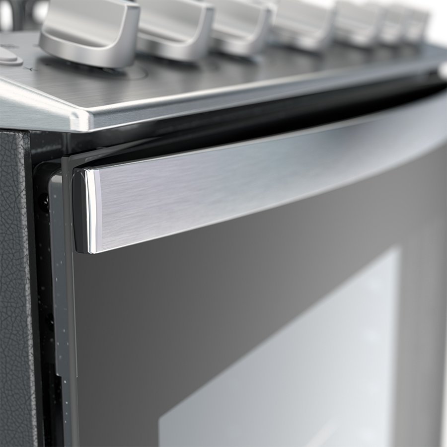 El panel Top Control con perillas inclinadas Push & Turn brinda manejo cómodo y seguro, mientras el encendido electrónico por botón simplifica el arranque. El horno de 5.1 pies³ incluye luz interior, 1 parrilla y puerta panorámica para controlar la cocción sin abrir. El recubrimiento Ever Clean ayuda a que la limpieza sea más sencilla. Además, trae 3 parrillas de alambrón mate y comal teflonizado para mayor versatilidad.