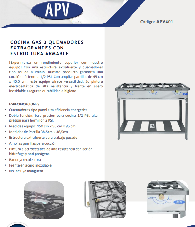 Esta cocina lineal a gas es una solución industrial de alto rendimiento diseñada para entornos exigentes. Fabricada en acero inoxidable de alta resistencia, ofrece versatilidad y durabilidad, permitiendo cocinar a baja presión o emplearse como hornillón en modo de alta presión. Sus quemadores de novedoso diseño garantizan una alta eficiencia energética, mientras que la estructura extrafuerte y las amplias parrillas facilitan el trabajo pesado en cocina profesional. Además, cuenta con un frente en acero inoxidable y un acabado de pintura electrostática, asegurando una apariencia impecable y resistencia prolongada.