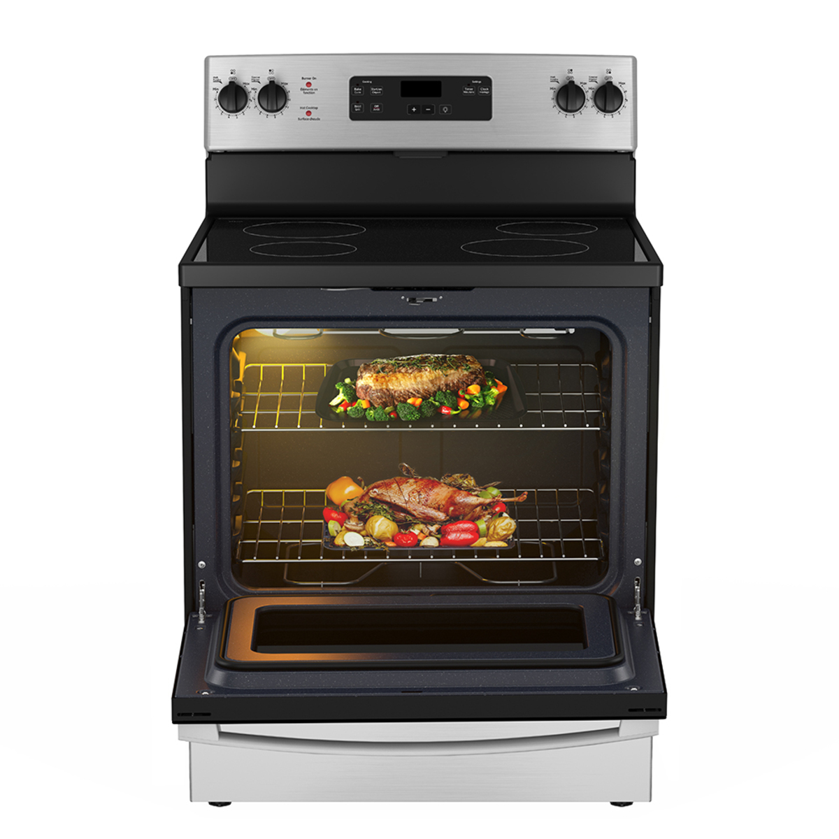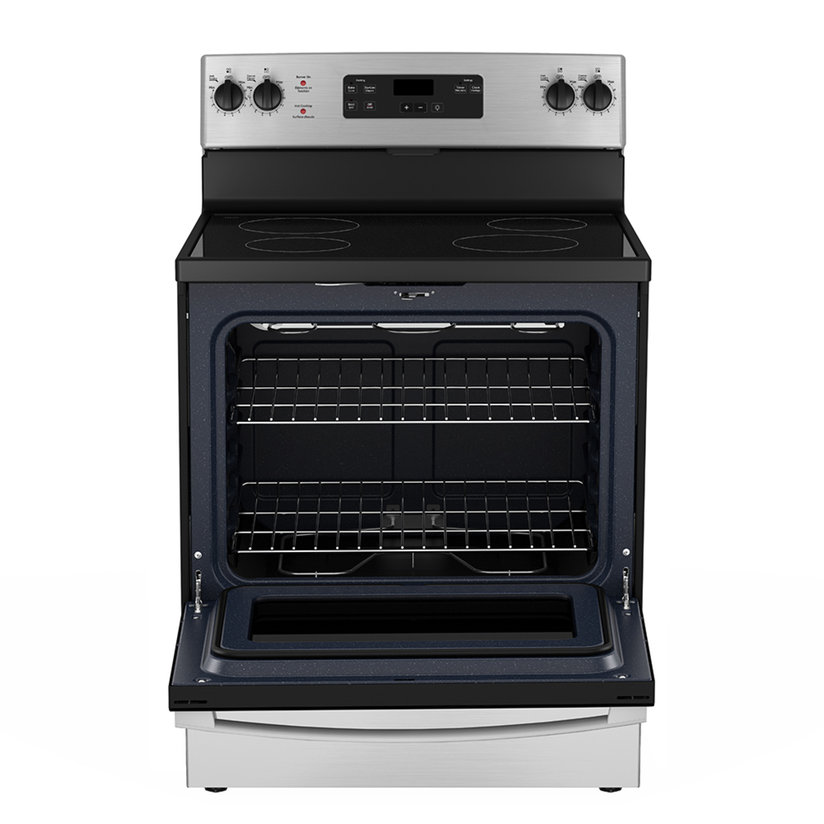 La GE JCBS630SKSS es una cocina eléctrica de 30″ con superficie vitrocerámica fácil de limpiar y 4 zonas radiantes para cocinar con calor uniforme. El horno eléctrico integra función grill (broil) y luz interior para monitorear sin abrir la puerta.
