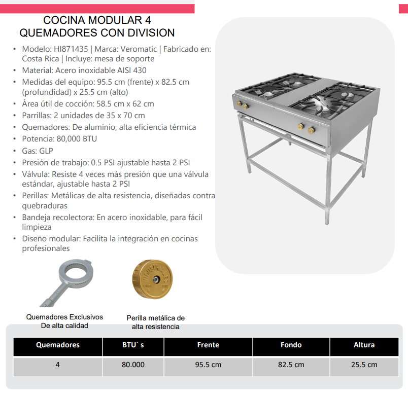 La Cocina Veromatic de 4 quemadores con división de 95 cm es una solución completa para cocinas comerciales que requieren potencia, durabilidad y eficiencia. Construida en acero inoxidable de alta calidad y con su propia mesa de soporte incluida, esta unidad está lista para usarse desde el primer día.
