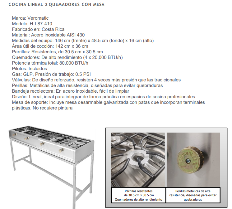 La parrilla a gas Veromatic modelo H-I-87-410 está diseñada para ofrecer máxima eficiencia y durabilidad en entornos de cocina profesional. Fabricada en Costa Rica con acero inoxidable AISI 430, incorpora cuatro potentes quemadores de alto rendimiento que entregan una potencia total de 80,000 BTU/h, distribuidos de manera uniforme sobre un área útil de cocción de 142 x 36 cm. Sus parrillas resistentes de 30.5 x 30.5 cm soportan el trabajo continuo y de alto volumen. Cuenta con válvulas reforzadas que resisten hasta 4 veces más presión que las tradicionales y perillas metálicas de alta resistencia, diseñadas para evitar quebraduras. El diseño lineal permite una integración práctica en cocinas modulares. Incluye bandeja recolectora de fácil limpieza y una mesa de soporte galvanizada desarmable con terminales plásticas que no requiere pintura. Una opción profesional, confiable y duradera para cocinas exigentes.