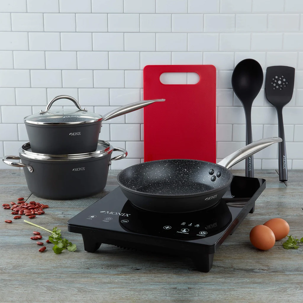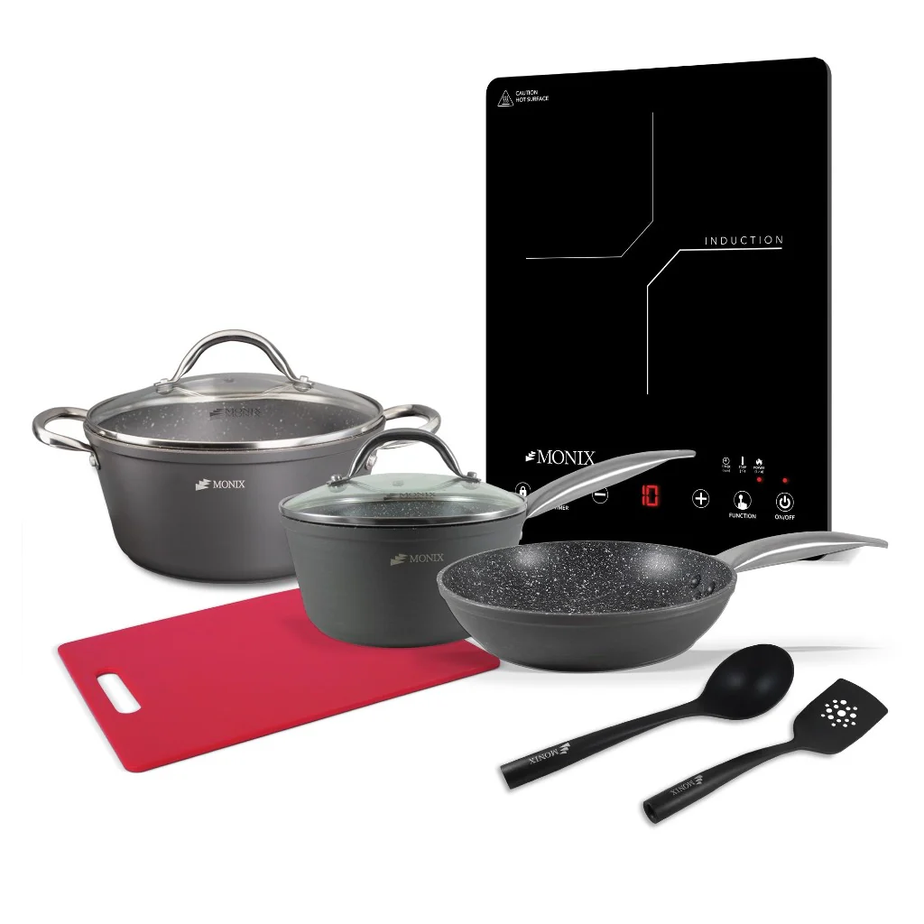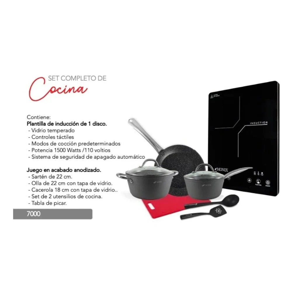 La plantilla de inducción permite una cocción rápida, precisa y segura, generando calor directamente en las ollas y reduciendo el consumo energético. El set de ollas incluido está diseñado para funcionar correctamente con inducción, ofreciendo versatilidad para preparar múltiples recetas del día a día.