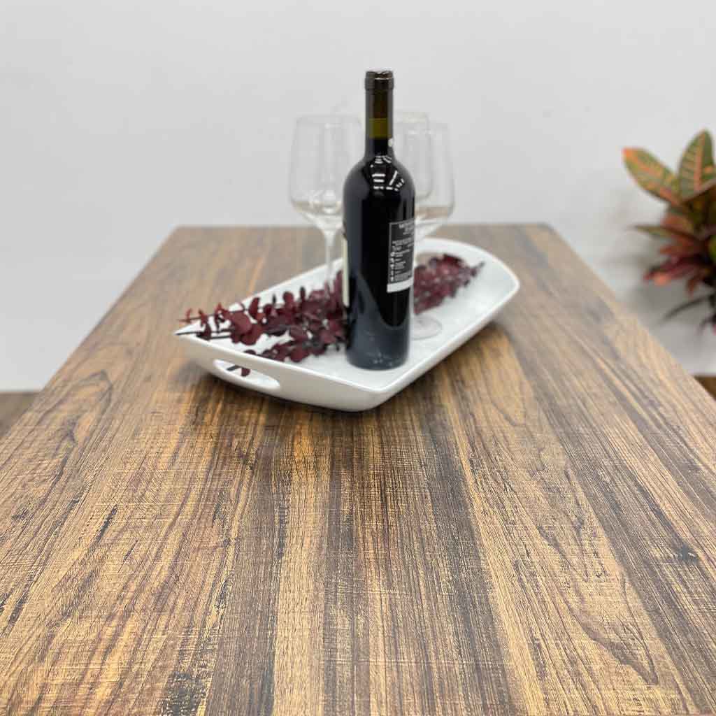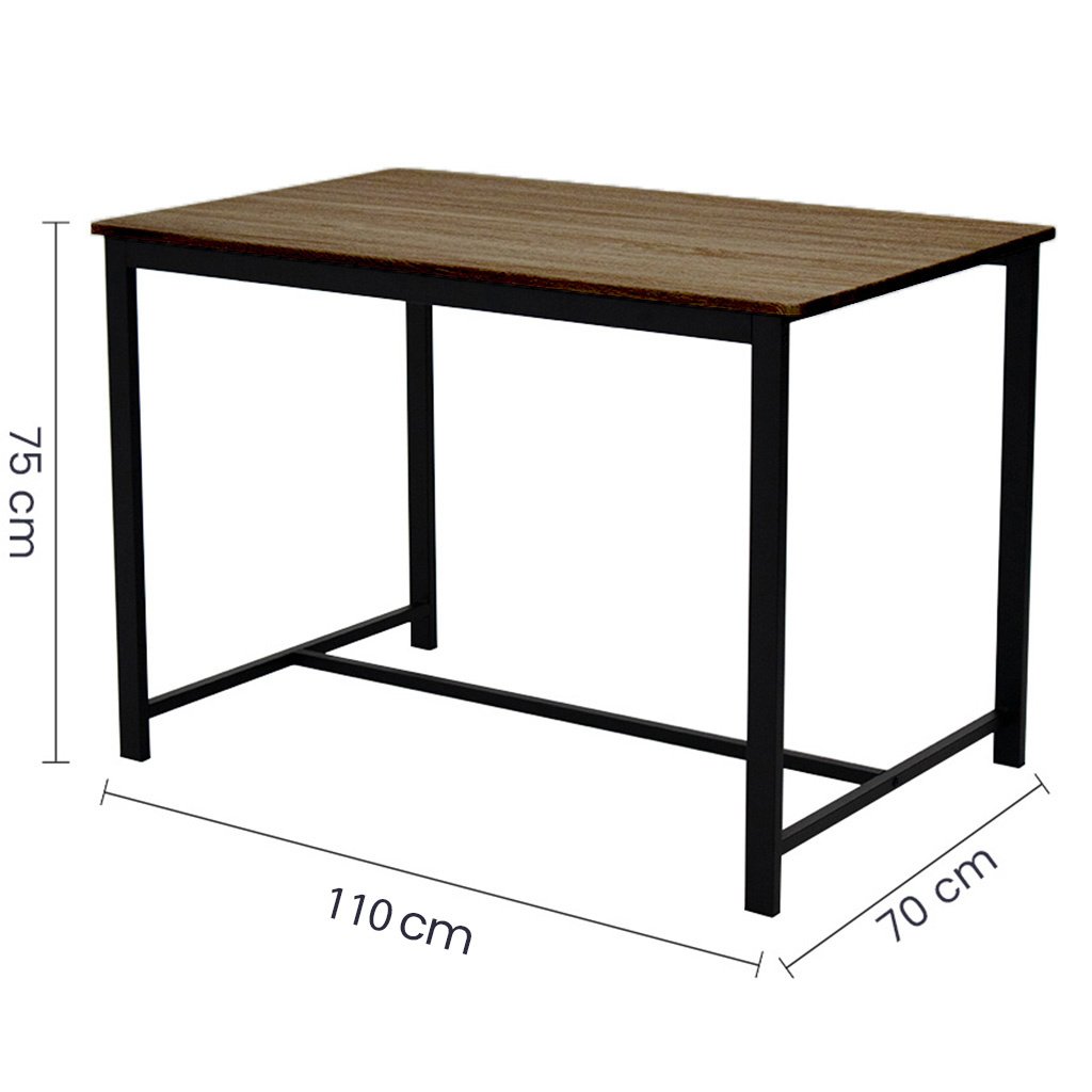 Su estructura en metal negro de alta calidad asegura estabilidad y durabilidad, mientras que las superficies en melamina rústica aportan un diseño moderno que se adapta perfectamente a terrazas, jardines, comedores pequeños o áreas comunes. Con líneas simples y acabados elegantes, este set brinda un toque cálido y contemporáneo a tus ambientes.