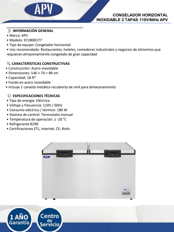 El Congelador Horizontal Inoxidable de 2 Tapas APV está diseñado para satisfacer las exigencias del almacenamiento profesional de alimentos, combinando alta capacidad, eficiencia energética y durabilidad industrial.