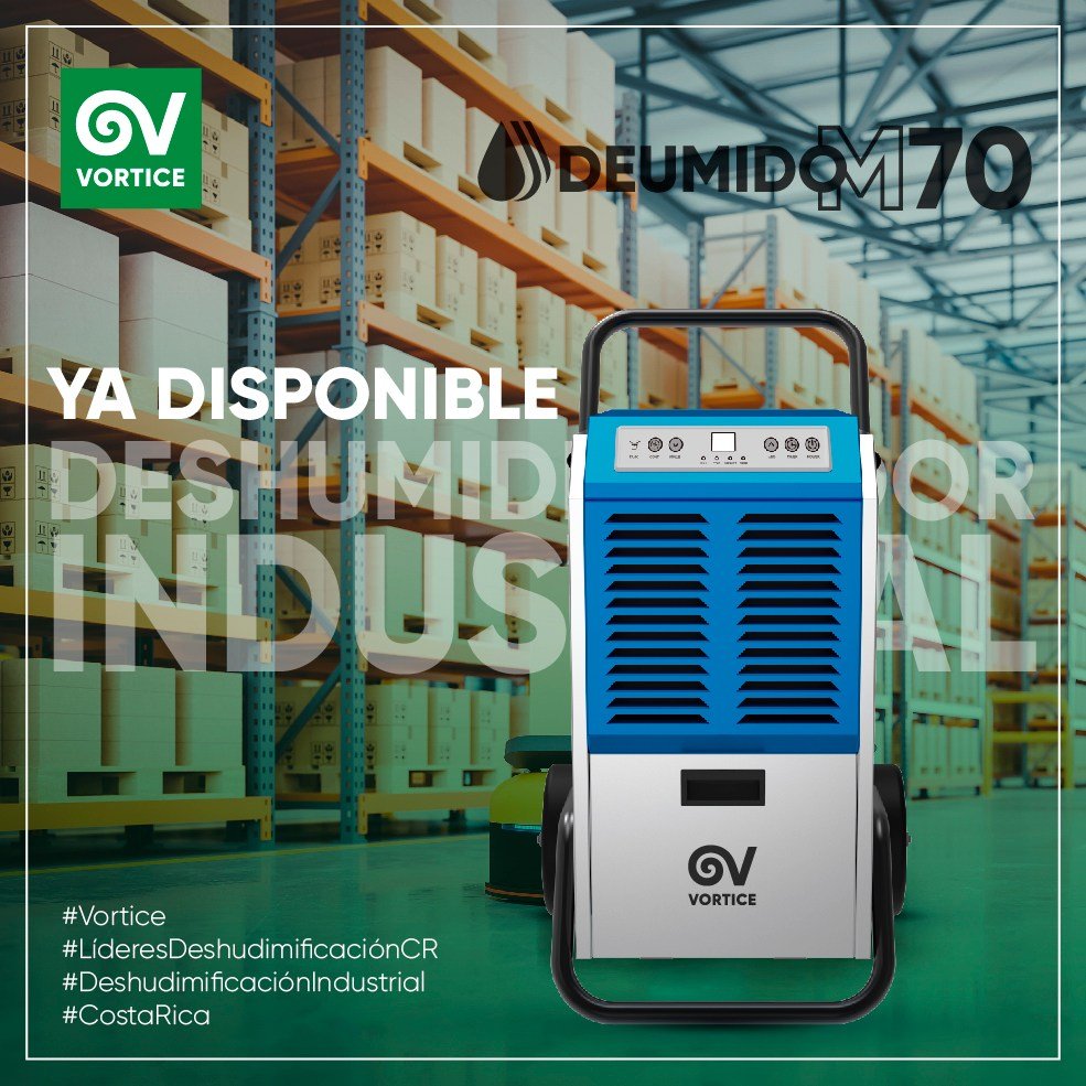 El Vortice Deumido M70 es un deshumidificador industrial de alta eficiencia para áreas comerciales e industriales de hasta 200 m². Con capacidad de extracción de 70 L/día, mantiene la humedad bajo control para evitar moho, malos olores y corrosión en bodegas, talleres, locales y salas técnicas.