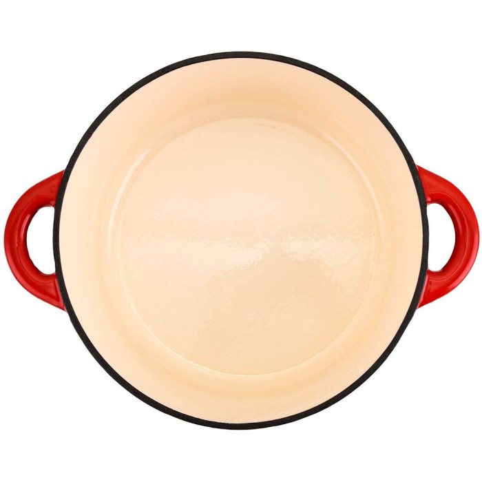 Su construcción en hierro fundido con recubrimiento esmaltado permite cocinar sin necesidad de curado, facilitando la limpieza y evitando la absorción de olores o sabores.