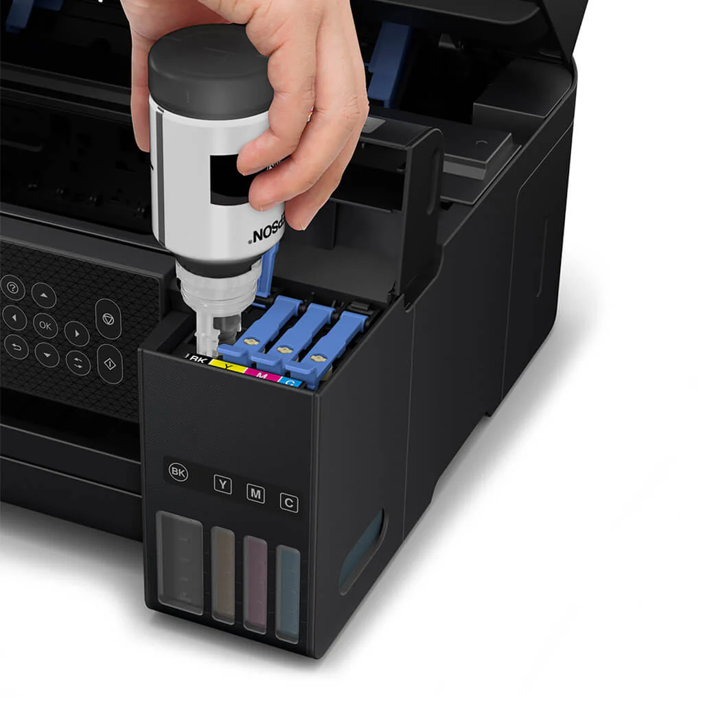 Brinda calidad Epson para textos nítidos y colores consistentes, botellas de alto rendimiento para tiradas largas y un diseño compacto ideal para hogar u oficina. La operación es sencilla gracias a su panel intuitivo y a las funciones de mantenimiento guiado.