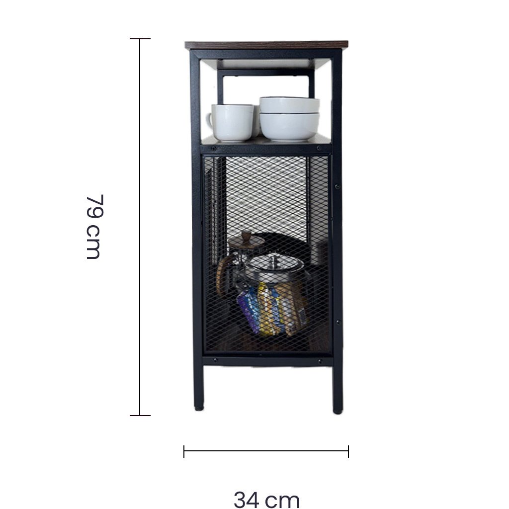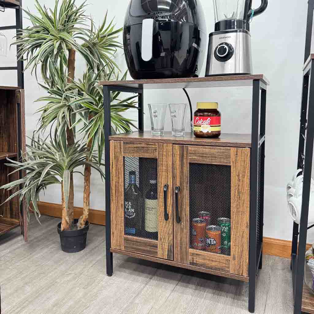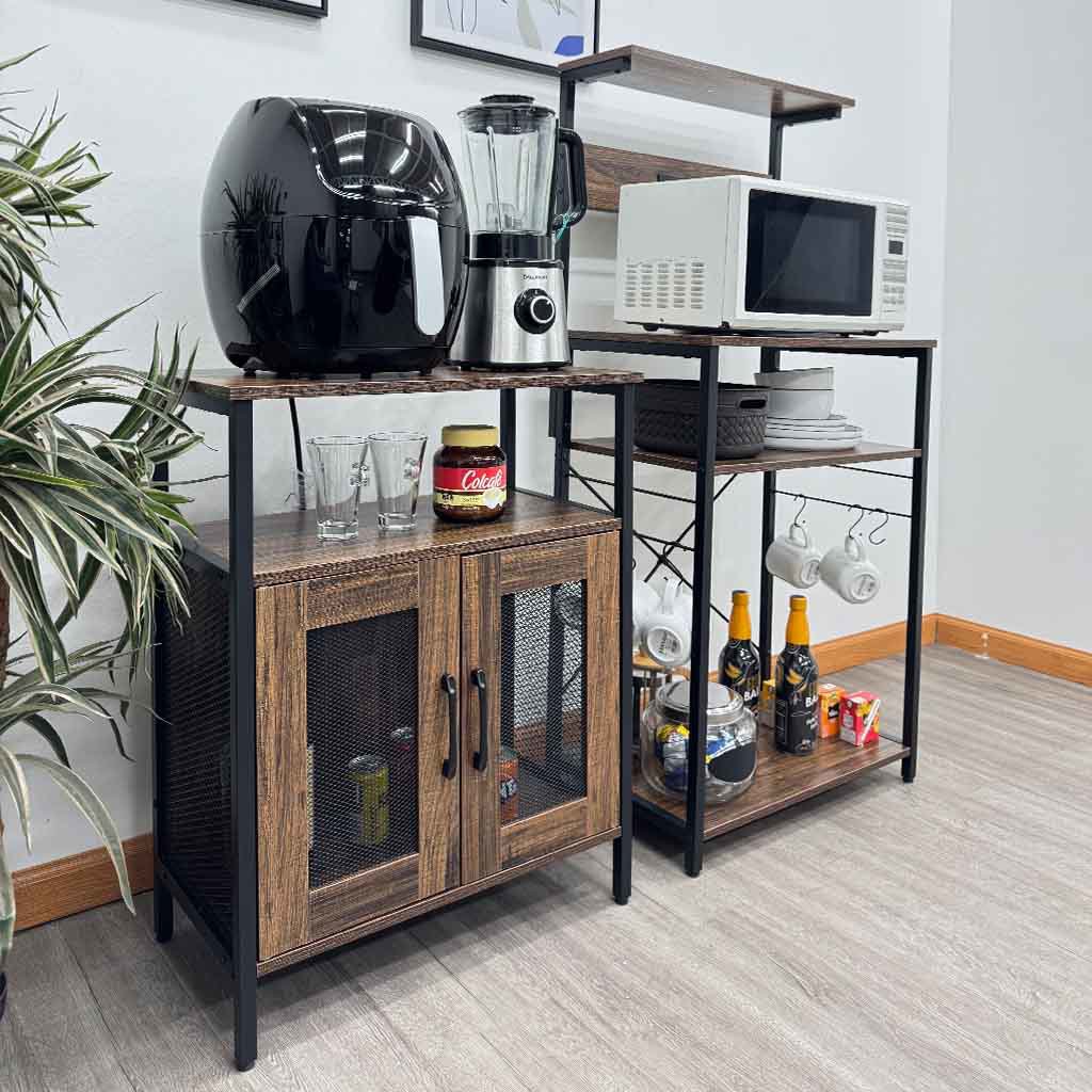 Fabricado en metal negro y melamina rústica de alta calidad, este mueble ofrece resistencia y durabilidad, aportando además un diseño moderno y elegante que se adapta a cualquier decoración. Sus estantes permiten organizar utensilios, electrodomésticos pequeños, recipientes o cualquier otro artículo de cocina que necesités tener a mano.