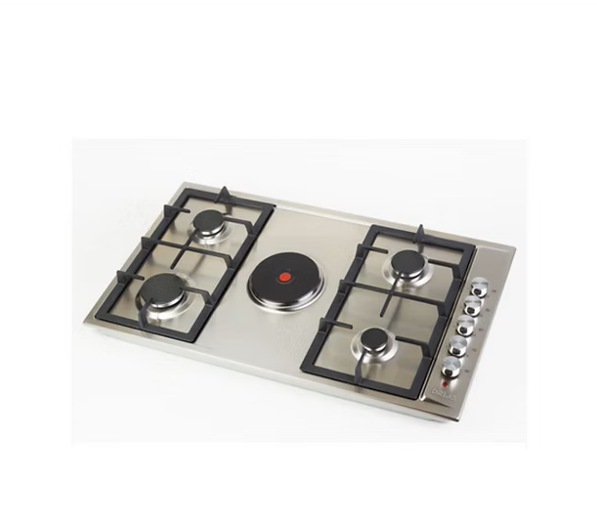 Cuenta con cuatro quemadores a gas para una cocción eficiente y controlada, junto con un quemador eléctrico de disco sólido, ideal como apoyo cuando se requiere estabilidad térmica constante. Incorpora válvulas de seguridad, indicador de encendido y perillas de lujo, brindando control preciso y mayor seguridad durante el uso diario.