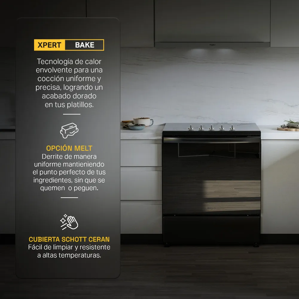 La Whirlpool WFRE1260B es una estufa eléctrica de 30 pulgadas Xpert Cooking diseñada para brindar desempeño, eficiencia y estilo en la cocina moderna. Su cubierta de vitrocerámica Schott Ceran ofrece una superficie resistente y muy fácil de limpiar, ideal para el uso diario sin complicaciones.