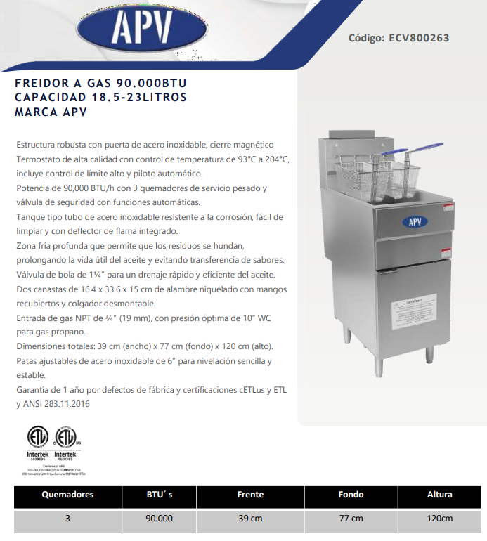 La freidora a gas APV de 90,000 BTU es ideal para cocinas profesionales que demandan potencia, eficiencia y durabilidad. Su tanque de hasta 23 litros, combinado con tres quemadores de servicio pesado, ofrece una fritura rápida y uniforme, manteniendo el sabor y la textura perfectos.