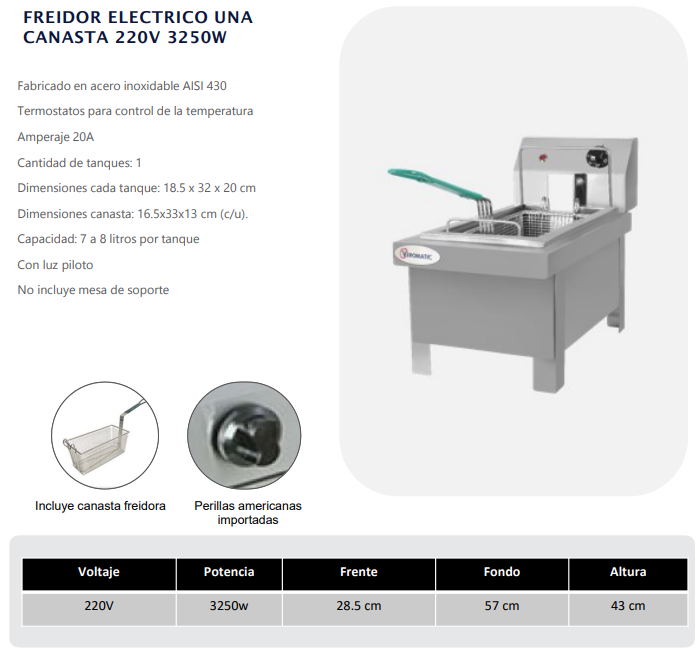 Diseñado para cocinas que requieren potencia, durabilidad y eficiencia, este freidor eléctrico de una canasta de 220 V y 3250 W ofrece un rendimiento superior en cada uso. Su estructura está fabricada en acero inoxidable AISI 430, resistente a la corrosión, fácil de limpiar y apta para trabajo continuo.