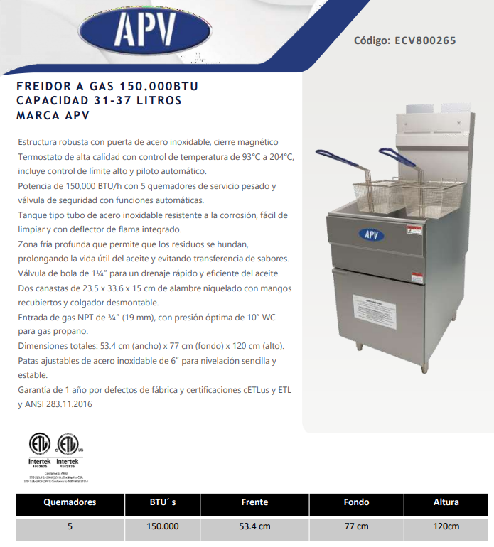 Con cinco quemadores de servicio pesado, sistema de encendido automático y control térmico de alta precisión, esta freidora es el aliado perfecto para negocios que requieren velocidad, volumen y calidad en sus frituras.