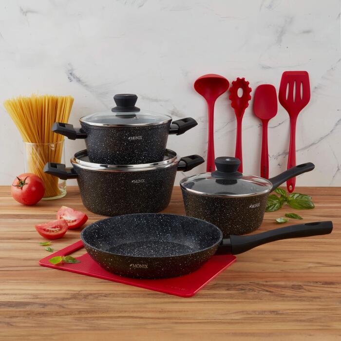 Este set de ollas Monix Mármol Negro de 12 piezas está pensado para quienes buscan practicidad, durabilidad y una cocina más eficiente. Su recubrimiento antiadherente de mármol permite cocinar con menos aceite, facilita la limpieza y evita que los alimentos conserven olores o sabores.
