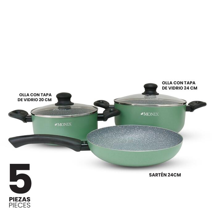 El acabado verde aporta un estilo moderno y elegante que combina funcionalidad con diseño. Ideal para preparar desde recetas rápidas hasta comidas completas para la familia, este juego reúne las piezas esenciales para una cocina bien equipada.