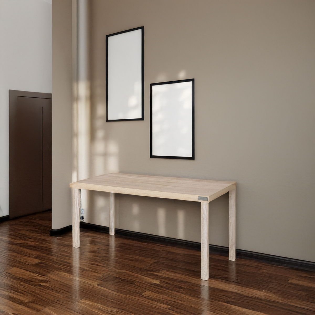 Fabricada en MDF/PB mixto con laminación en papel decorativo, ofrece un aspecto cálido tipo madera natural. Su tablero hueco de 39 mm y patas de 40 mm brindan estructura sólida con un peso optimizado, facilitando su manipulación e instalación.