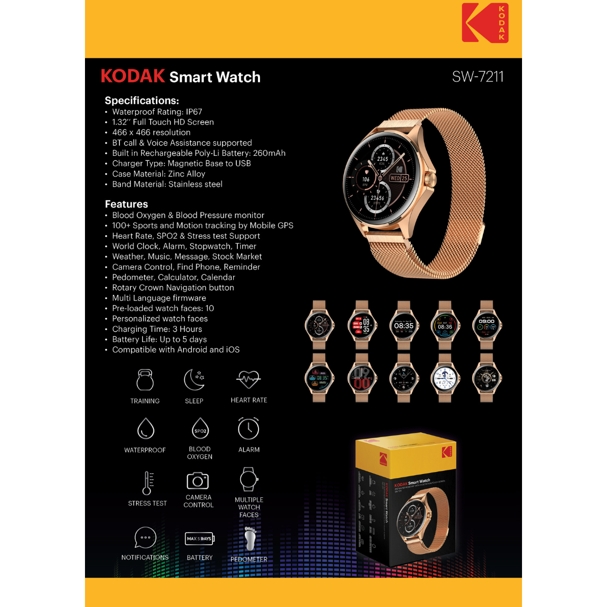 El reloj inteligente SW7211 de Kodak destaca por su diseño elegante en tono oro rosa y su avanzada funcionalidad para el día a día. Incorpora una pantalla táctil HD de 1.32 pulgadas con alta resolución, que brinda una experiencia visual nítida y fluida para interactuar con notificaciones, aplicaciones y métricas de actividad.