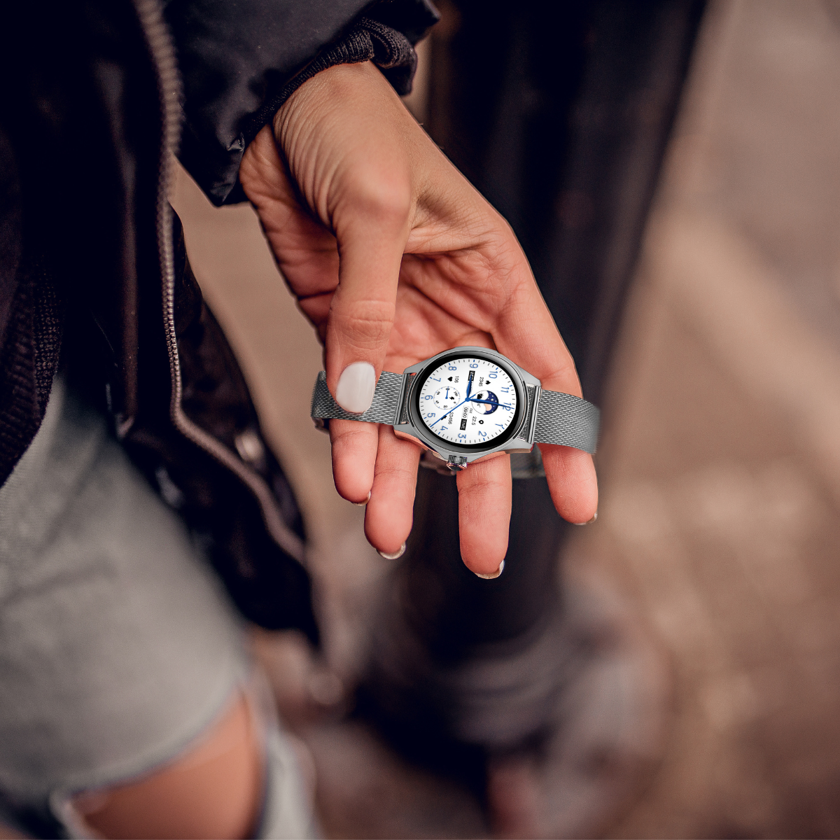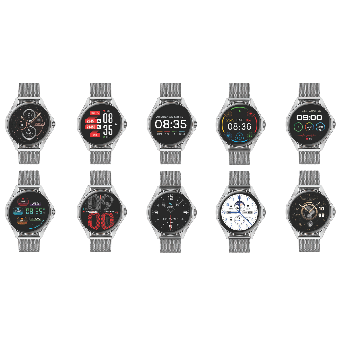 Su batería recargable de 260 mAh brinda hasta 5 días de autonomía, mientras que la carga magnética por USB asegura una experiencia práctica y rápida. La caja de aleación de zinc junto con la correa de acero inoxidable en acabado plateado le otorgan un estilo elegante, ideal tanto para uso profesional como personal.