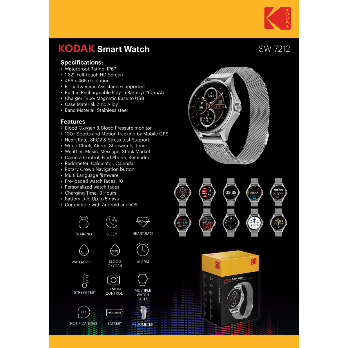 El reloj inteligente SW7212 de Kodak combina diseño sofisticado con tecnología funcional para el uso diario. Su pantalla táctil HD de 1.32 pulgadas ofrece una visualización clara y fluida, ideal para consultar información, notificaciones y métricas de actividad con solo un toque.
