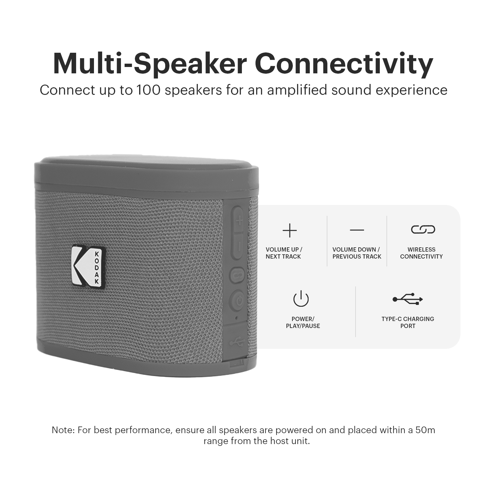 El Soundbrix™ portátil de Kodak está pensado para quienes buscan un parlante versátil, fácil de transportar y con un diseño moderno que se adapta a cualquier entorno. Su tamaño compacto y peso liviano lo hacen ideal para acompañarte en casa, la oficina, viajes o actividades al aire libre.