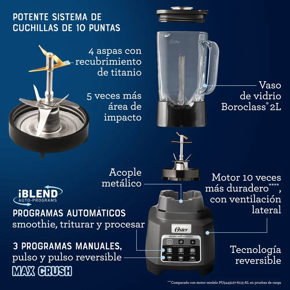La Oster Xtreme Mix BLSTXPG-BW está diseñada para lograr mezclas potentes y consistentes a diario. Su vaso de vidrio 1.5 L no retiene olores ni sabores y soporta cambios de temperatura, mientras el sistema All-Metal Drive (acople metálico) brinda una transmisión más resistente. Con velocidades múltiples + función Pulso ajustás la potencia a cada receta, desde smoothies y salsas hasta hielo picado. Las cuchillas de acero inoxidable y la tapa con dosificador facilitan preparar y añadir ingredientes en marcha. Es una licuadora confiable, fácil de usar y de limpiar para la cocina de todos los días.