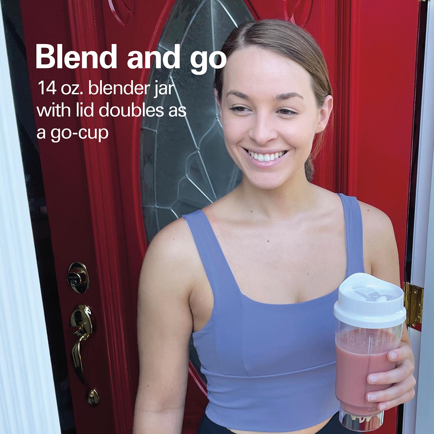 Incluye un recipiente de 14 oz (~414 ml) que funciona como vaso portátil con tapa, compatible con portavasos de carro.