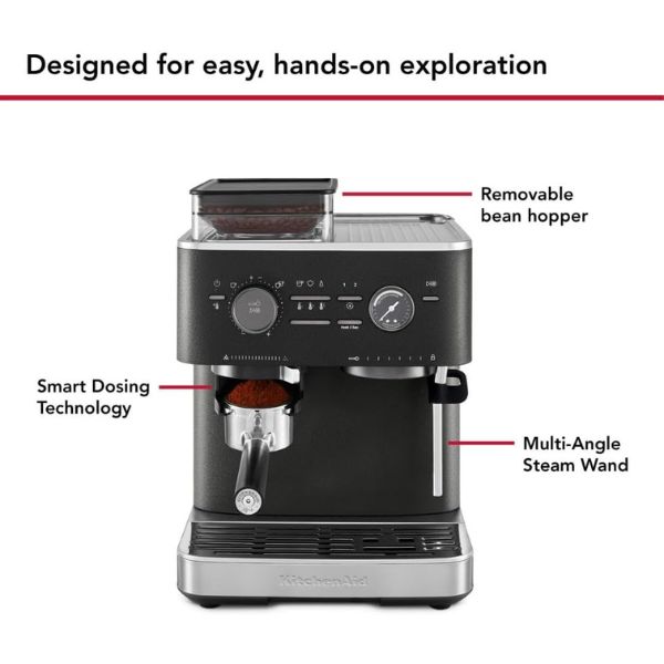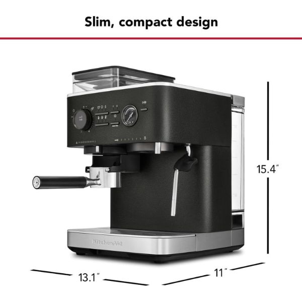 La KitchenAid KES6551 eleva la experiencia del café en casa combinando una máquina de espresso semiautomática con un molinillo de rebabas integrado. Su bomba italiana de 15 bares garantiza una extracción precisa que realza los aromas y la textura del café, logrando espressos intensos y consistentes en cada preparación.