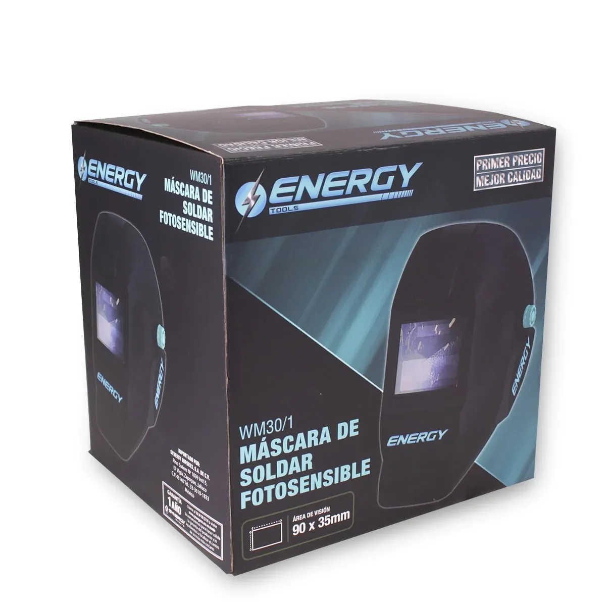 La máscara de soldar fotosensible Energy WM30/1 está diseñada para ofrecer protección avanzada en trabajos de soldadura profesional. Su amplio visor de 90 × 35 mm brinda una visión clara y segura, mientras que sus dos sensores integrados garantizan un oscurecimiento automático preciso al detectar el arco de soldadura.