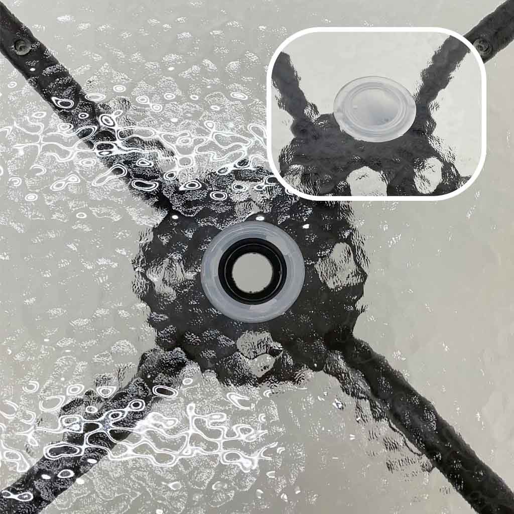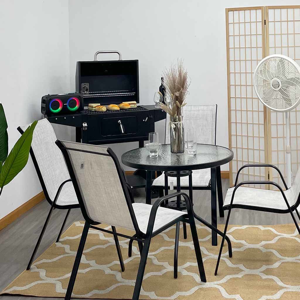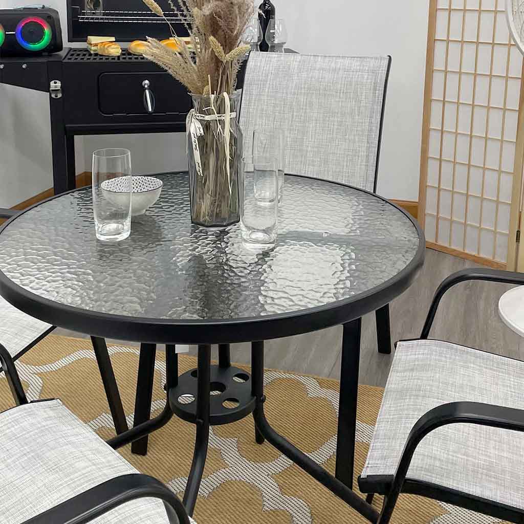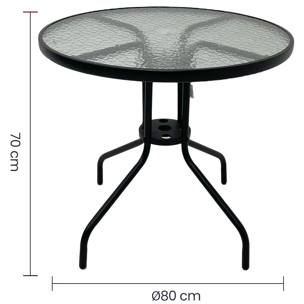 Fabricada con estructura metálica negra y sobre de vidrio templado con ondas, esta mesa combina durabilidad, estilo y fácil mantenimiento. Su acabado sobrio y moderno permite combinarla fácilmente con diferentes estilos de decoración. Además, incluye un hueco central para sombrilla, ideal para espacios al aire libre.