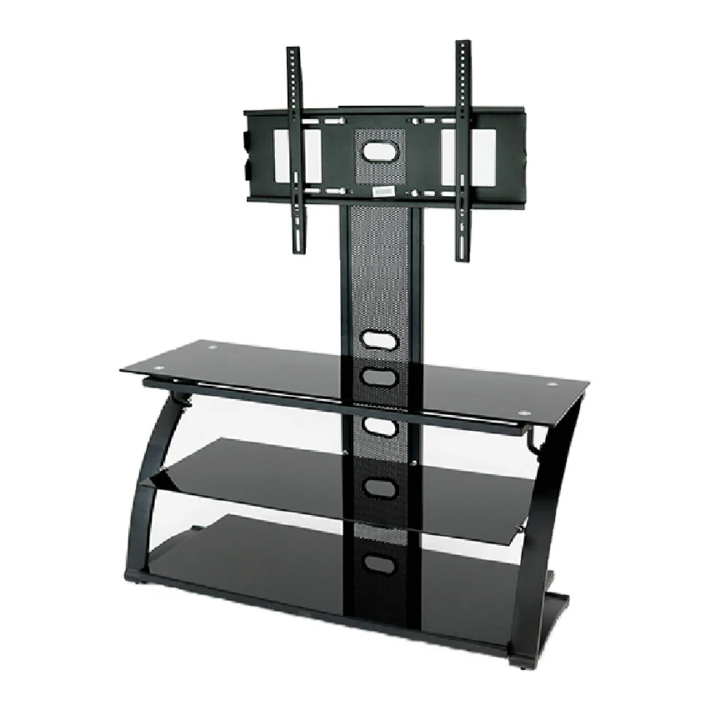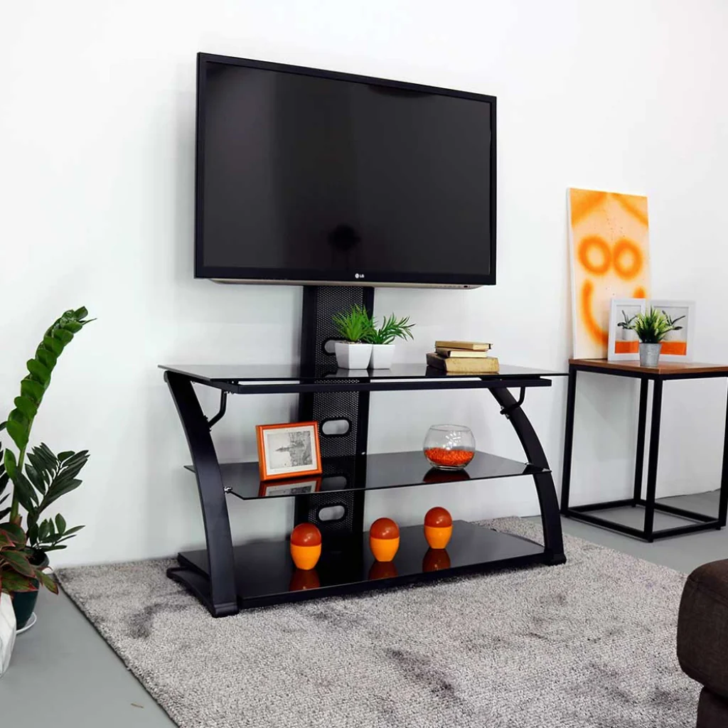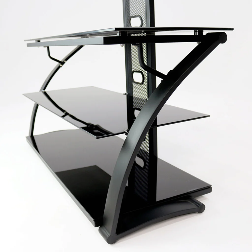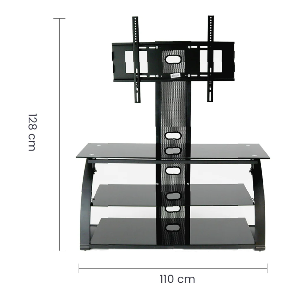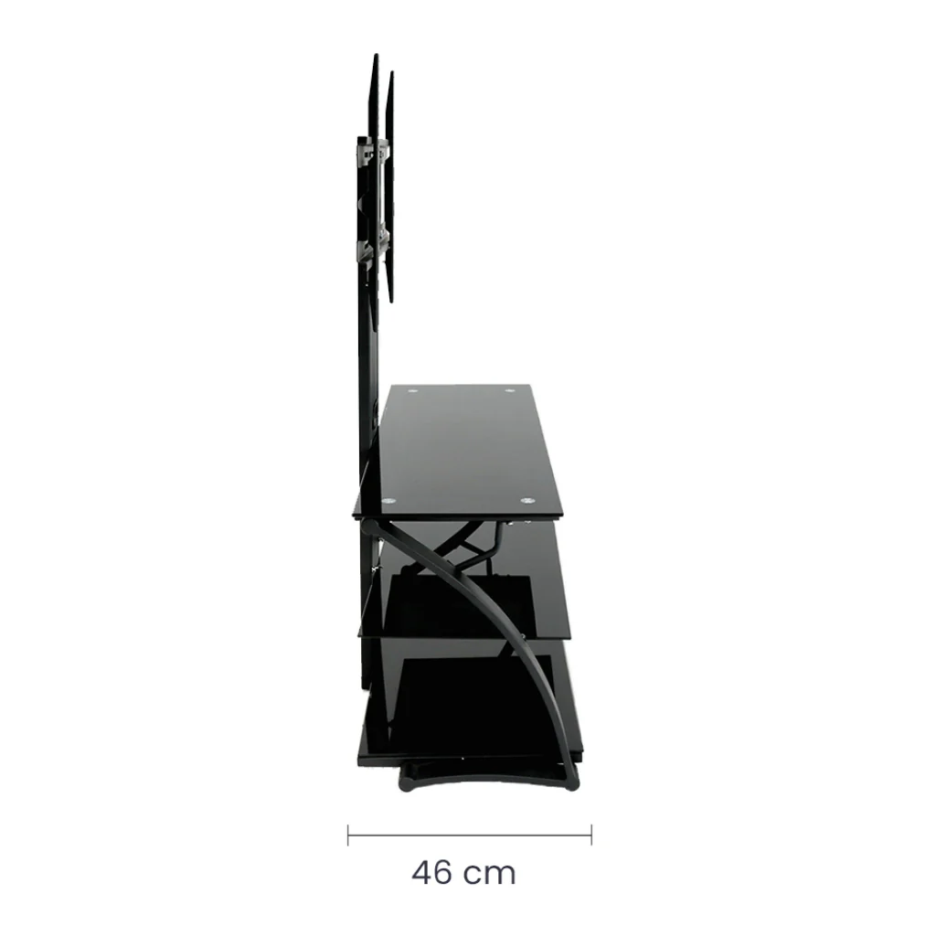 Con capacidad de hasta 45 kg, esta mesa es ideal para pantallas de hasta 50 pulgadas, mientras que sus tres estantes de vidrio ofrecen espacio adicional para consolas, reproductores, parlantes o decoración.