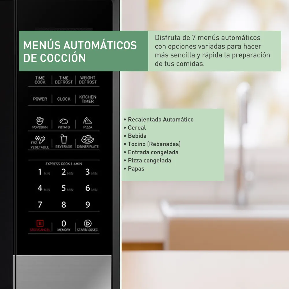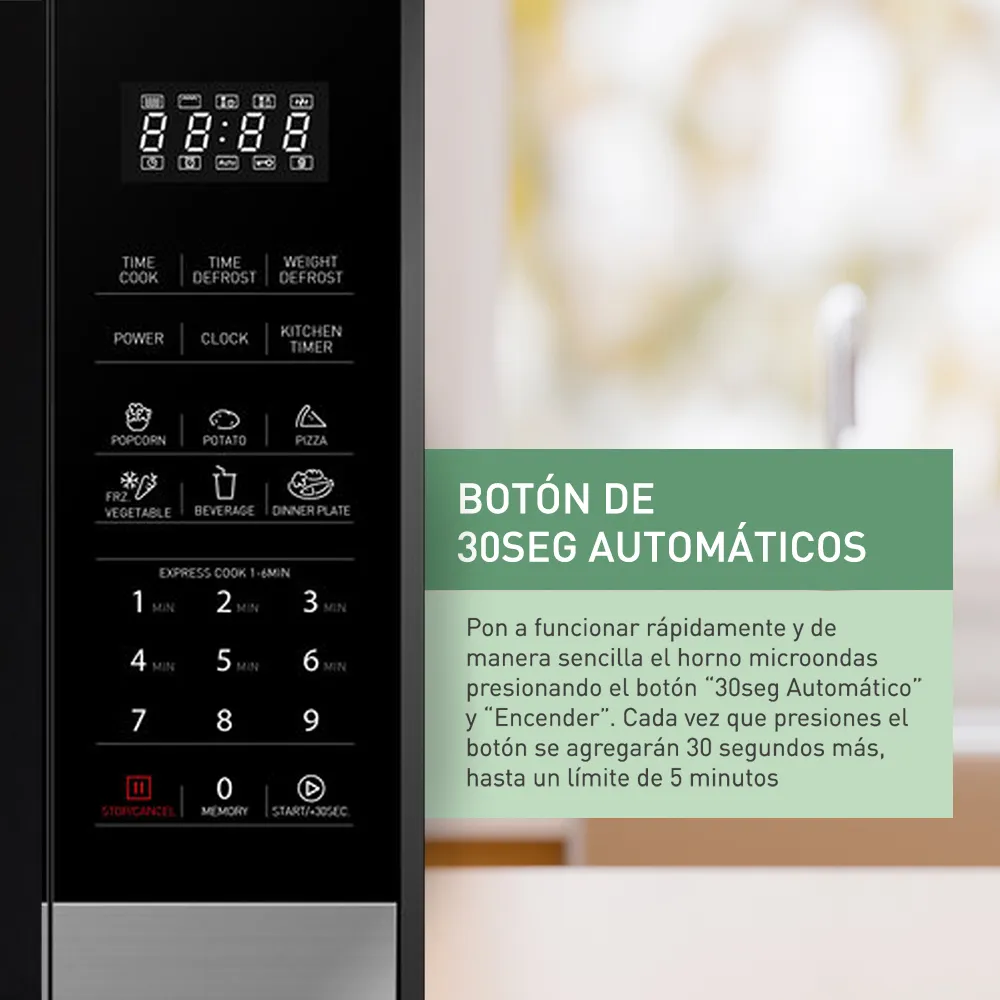 Su acabado negro y plateado le da un toque elegante que se adapta a cualquier estilo de cocina, mientras que su puerta de vidrio transparente permite supervisar la cocción sin abrirla. Incorpora funciones de calentamiento rápido y descongelado parejo, optimizando el tiempo y asegurando resultados consistentes.