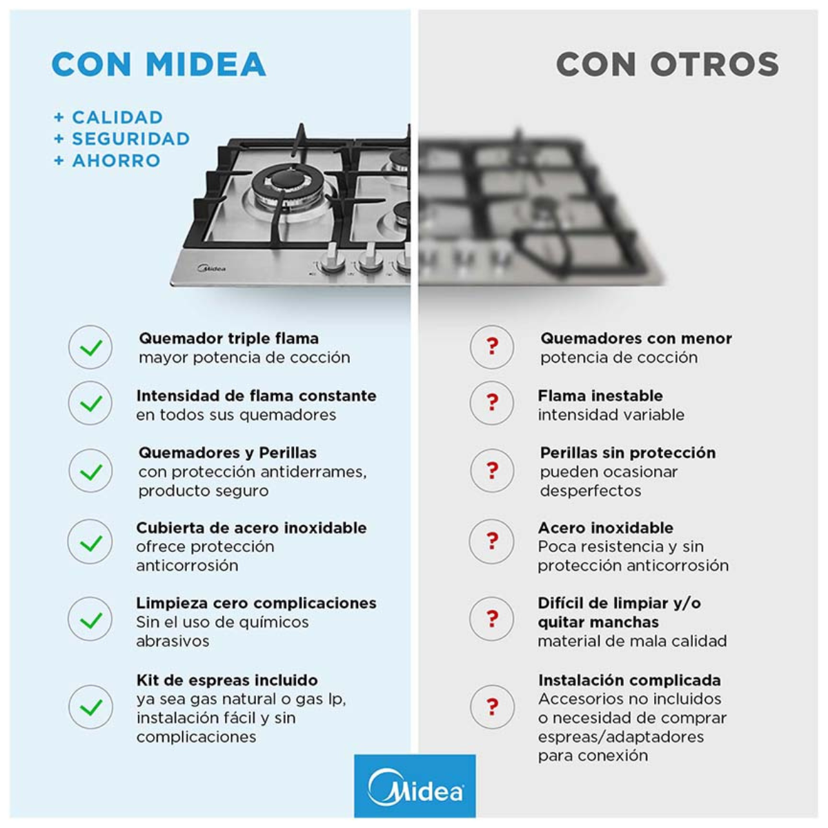 La estufa empotrable a gas Midea modelo MTGB30TL3402GS está pensada para cocinas modernas que requieren potencia, control y durabilidad en un formato elegante de 30 pulgadas. Su quemador Triple Flama proporciona una distribución envolvente del calor, ideal para cocciones rápidas, salteados y recipientes de gran tamaño.