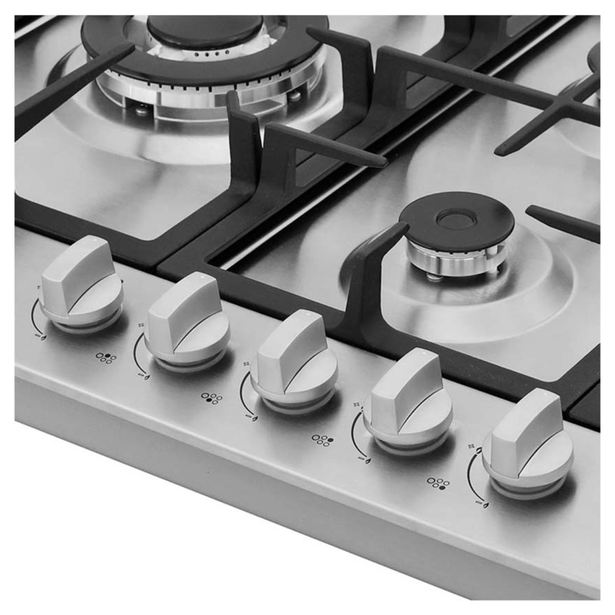 La superficie en acero inoxidable facilita la limpieza y mantiene una apariencia profesional por más tiempo. Sus parrillas de hierro fundido de diseño continuo permiten desplazar ollas y sartenes con seguridad, reduciendo riesgos de derrames y ofreciendo mayor estabilidad durante la cocción.