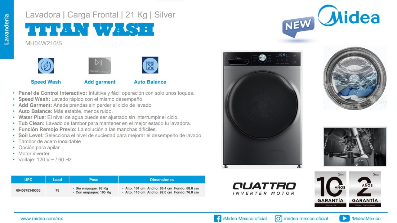 Es una lavadora pensada para alto desempeño, eficiencia energética y comodidad avanzada. Su gran capacidad y tecnología Inverter la convierten en una solución ideal para quienes buscan potencia, silencio y ahorro en un solo equipo.