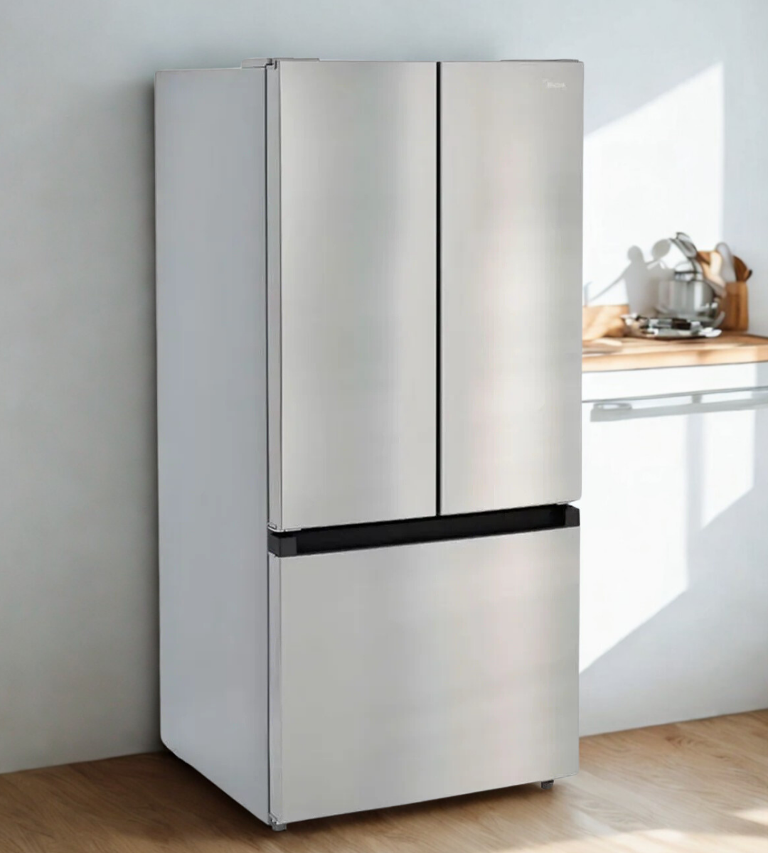 El refrigerador de 19 pies cúbicos con diseño French Door está pensado para hogares modernos que buscan mayor capacidad, eficiencia y elegancia. Su acabado plateado aporta un estilo sofisticado, mientras que su estructura de tres puertas facilita una organización práctica y acceso inteligente a los alimentos.