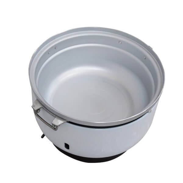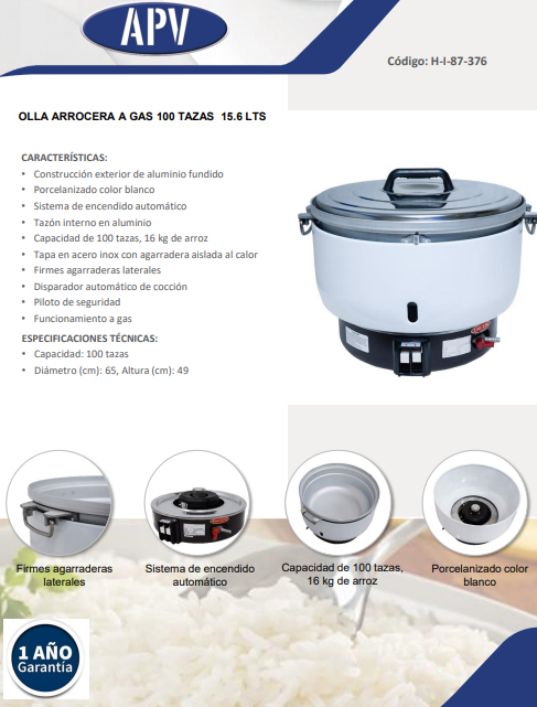 Equipada con encendido automático, piloto de seguridad y disparador de cocción, permite preparar hasta 16 kg de arroz (100 tazas) sin necesidad de supervisión constante.